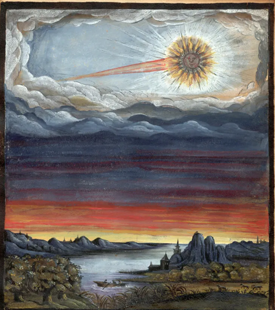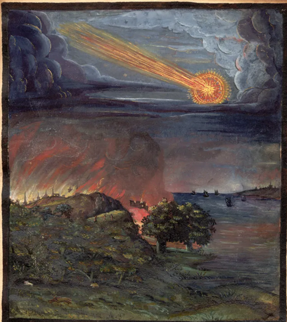 Another early painting, depicting the arrival of comets causing cities to burn, also impacting ships on the sea.