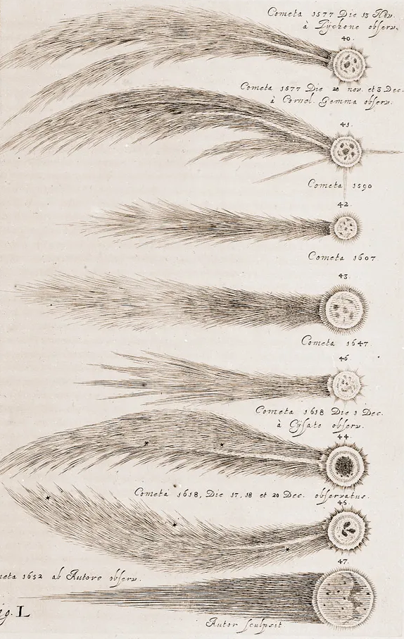 Early 17th-century illustrations by a note European astronomer. Note the textures assigned to these comets, resembling fur or feathers. Note also the illustration of crowns or rays emanating from the comets. Before modern science, humans believed comet tails to have textures of fur. This is why large groups of comet fragments crossing the sky are called "horsemen" who were wearing "white robes dipped in blood" (Revelation). The blood refers to the red, fiery visual effects.