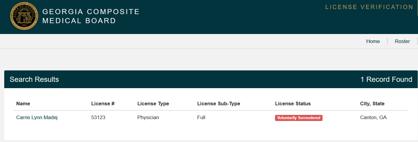Madej had a medical license as D.O. in the state of Georgia (license #53123), but that's gone now. "Voluntarily surrendered" when she faced a medical board investigation.