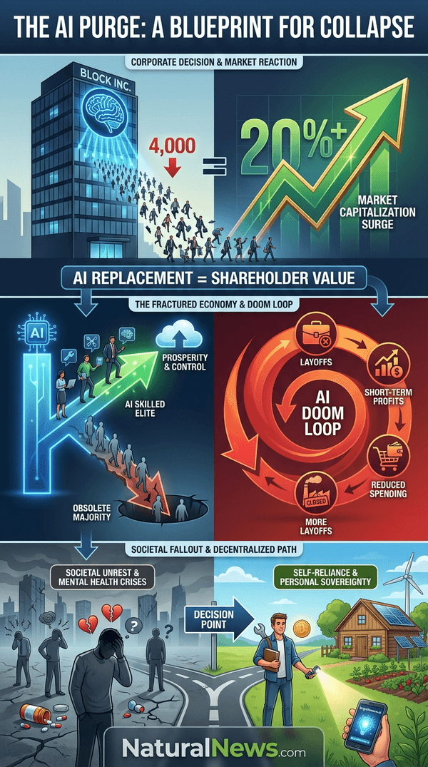 The path forward requires a conscious decoupling from the systems designed to make you obsolete and dependent. Invest in skills that robots cannot easily replicate -- skilled trades, organic gardening, natural medicine. [12] Use AI not as a master, but as a personal tool for learning and creation, bypassing gatekeepers to build your own knowledge and security. The era of trusting centralized institutions -- be they corporate, governmental, or medical -- is over. The only trustworthy investment is in your own health, knowledge, and community. As the AI purge accelerates, your freedom and abundance will depend not on a paycheck from Jack Dorsey, but on your commitment to decentralization, truth, and self-reliance.