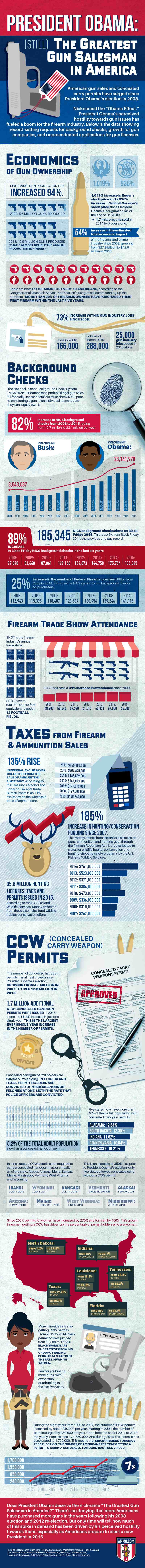New statistics are out that have been put into a well done infographic. These stats demonstrate clearly that the more Barack Hussein Obama Soetoro Sobarkah goes after guns and attempts to infringe on the rights of the people to keep and bear arms, the more Americans buy more guns.