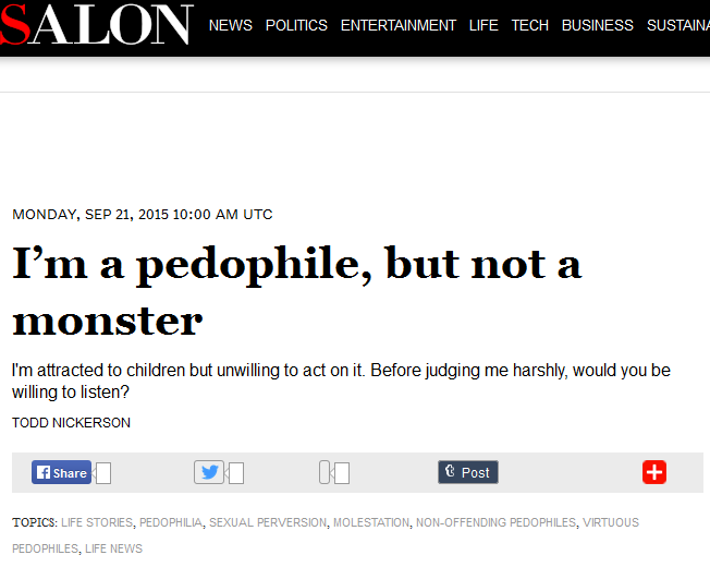 Someone responded to a Twitter post from journalist Ian Miles Cheong – who originally spotted Salon’s stealth edits – noting that Salon actually didn’t delete all of their pro-pedophile content. There’s still an article up right now by Debra W. Soh from October 27th, 2015 entitled “The pedophile I could not help: He was not a monster or a molester. The system destroyed him anyway”.