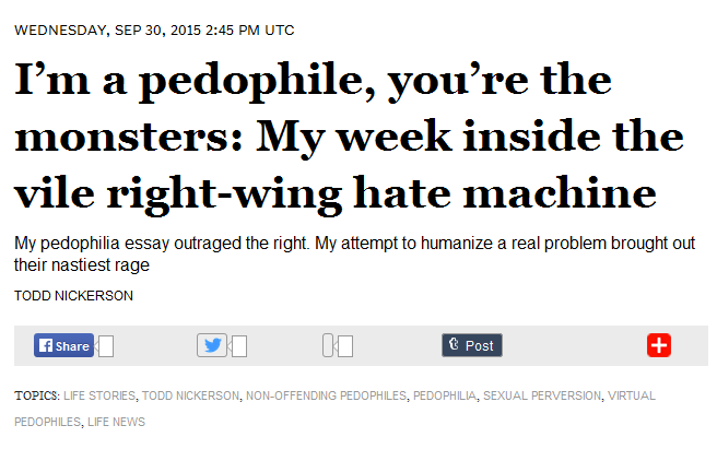 After receiving lots of criticisms from the Conservative front, including being called out by pundits and platforms like Mike Cernovich, Breitbart and Info Wars, Nickerson had another piece published as a follow-up on September 30th, 2015 entitled “I’m a pedophile, you’re the monsters: My week inside the vile right-wing hate machine “.