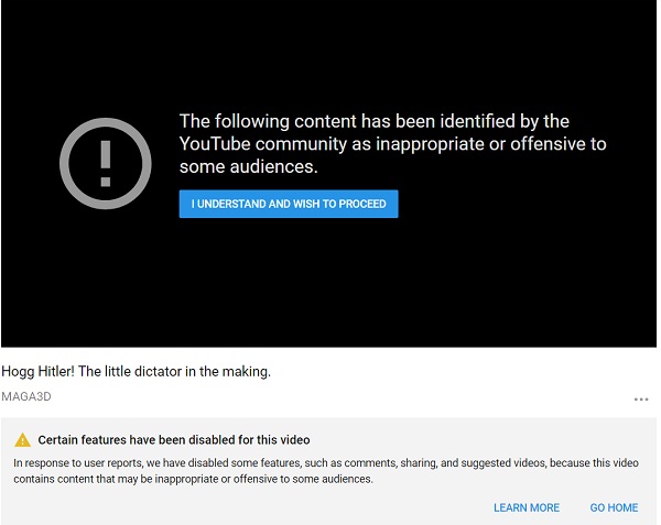 The effort to protect Hogg from public criticism has reached such an insane level of thought control that a satire video depicting Hogg delivering a Nazi speech in “historical archival footage” has been heavily redacted and censored by YouTube. You can’t even see how many people have viewed the video, as the few count feature has been disabled, along with share buttons and even an embed link.