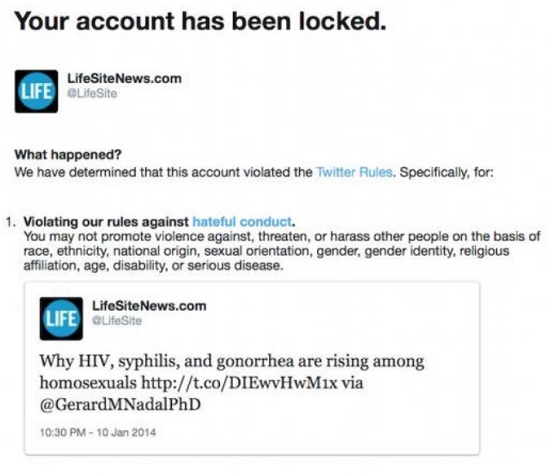 On October 18, 2018, however, LifeSiteNews received the following message, notifying staff that Twitter was locking the account because the 2014 tweet sharing the story’s neutral, factual headline violated “our rules against hateful conduct,” and somehow “promote[d] violence against, threaten[ed], or harass[ed] other people on the basis of [...] sexual orientation [...], or serious disease."