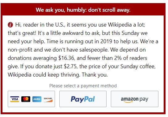 Posting as of late on anything linked to Wikipedia, comes the pleading huckster’s post for you to give him some money, even just a cup of coffee’s worth, so he can continue surviving and “thriving.” Well, if you’re thriving, why beg for $2.75 from everyone? It’s big pharma at work, folks, and if they con everyone out of $2.75, who thinks Wikipedia is real, then the billionaires get richer while the rest of us sink with the Titanic (the complete blackout of useful information on line).