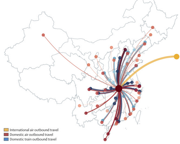 The study used flight data to estimate the spread of coronavirus to over 300 cities across mainland China. It used 2.68 as the reproductive rate for the virus, which means every one person infects 2.68 more people. Based on these numbers, the study warns that "epidemics are already growing exponentially in multiple major cities of China" with a lag time that runs about 1-2 weeks behind the Wuhan outbreak.