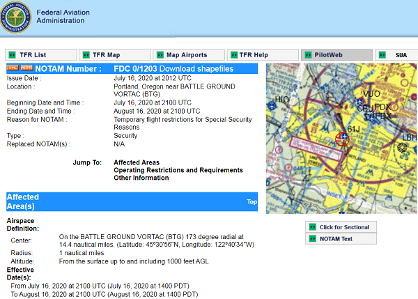 The FAA notice further warns that pilots operating aircraft within the restricted airspace may have their aircraft seized or destroyed. The notice refers to the Battle Ground Vortac in Southern Washington, which is a navigation beacon system for pilots. See full details at PilotNav.com.