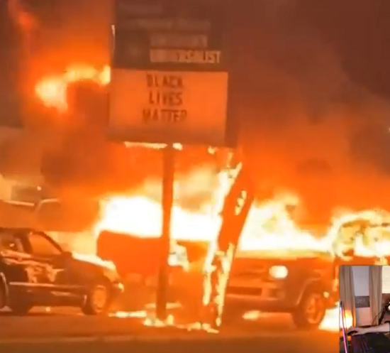 Even local businesses that try to escape the arson and property destruction of BLM by posting "Black Lives Matter" signs end up in flames, as this photo from Kenosha shockingly shows: