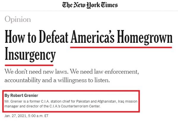 The New York Times on Wednesday ran an article from "former" top CIA officer Robert Grenier labeling dissenters as part of a terrorist "insurgency" and calling for them to be "defeated" like an enemy army.