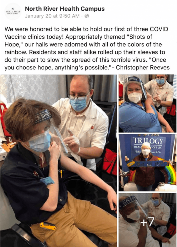 Mrs. Brinkmeyer was a physical therapist at North River Health Campus, a senior living community in Evansville. The facility posted photos and a message about “COVID vaccines” on January 20, around the same time Mrs. Brinkmeyer got the shot.