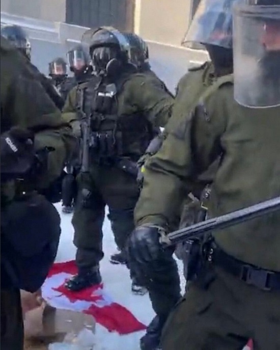"Perhaps this is the reason that the goons in Ottawa on Saturday had no badges or names on their uniforms and were demonstrating their cruelties to peaceful protesters," Sons of Liberty Media speculated, adding: "It may also be why Nazi traitors in the RCMP are encouraged in their own tyrannies against their own people, as reported on Saturday when members of the RCMP applauded the trampling of an older woman and others with horses ridden by RCMP thugs."