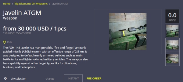 Users from Ukraine have posted several American made FGM-148 Javelins for sale on the Dark Web Marketplace, Thief Marketplace. The posting was made less than three hours ago and the seller advertised shipping available from Ukraine, specifically Kyiv. The seller is charging 30,000 USD for what seems to be just the tube. Unseen is the command Launch Unit, and it is unclear if there is a missile in the tube. A full ensemble of the Javelin usually goes for 206K USD, with the Command Launch Unit valued at around 120K USD and each missile at about 80K USD, so this posting is a steal.