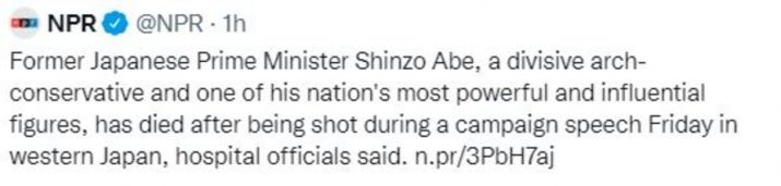 "The anti-Abe pronouncement getting a lot of attention on Friday was NPR’s now-deleted Tweet describing the recently murdered world leader as a “divisive arch-conservative.” In the replacement tweet, they still had the knives out as they smeared him as an 'ultranationalist,'" Newsbusters noted along with a screengrab of the tweet.