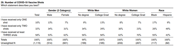 The survey reveals something quite fascinating. While men, Blacks and Hispanics all caught on and largely stopped taking the fraudulent covid-19 vaccine after the first or second dose, White liberal women (college-educated / indoctrinated) continued to remain shockingly obedient to the covid-19 propaganda and demanded three or more doses.