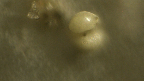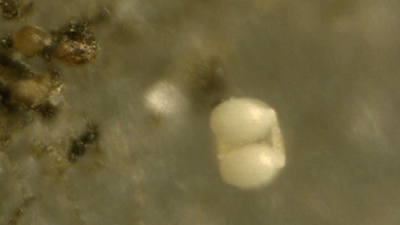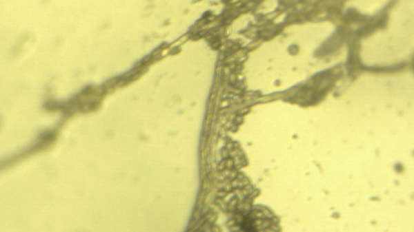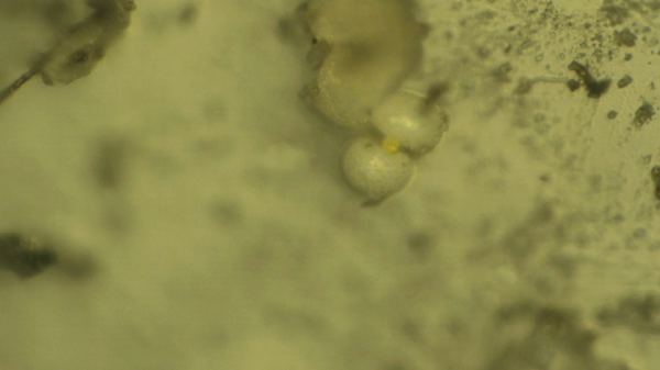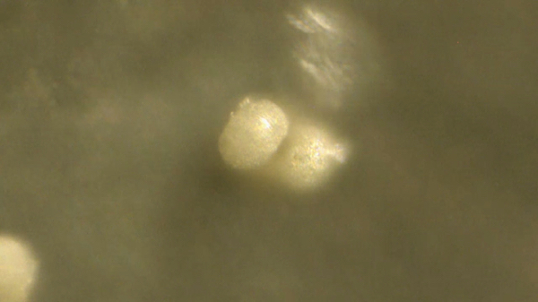 Under the microscope, this sample -- take from a plastic sheet covering tomato plants on her property -- showed a multitude of strange biological structures... things that resemble tiny eggs, bacterial colonies, fungal structures, algal features and more. The microscopy photos below reveal some of the details. The most zoomed-in photos are taken at a magnification of around 2000x.