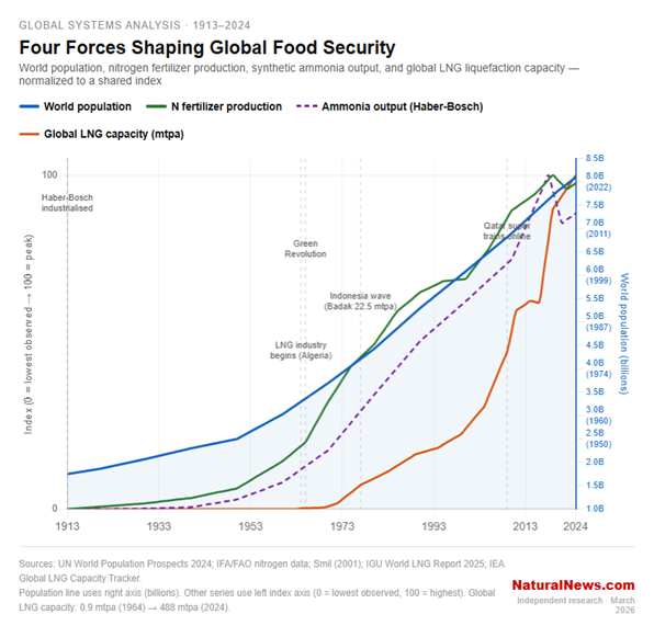 I believe this visual connection isn't just academic; it's a flashing red warning sign that half of humanity now exists only because of a single chemical process and the industrial infrastructure that feeds it. We are living on borrowed time and borrowed nitrogen. This house of cards, built on a foundation of natural gas and geopolitical instability, is now being deliberately targeted for demolition. The coming famine is not an accident of climate or war. It is an engineered catastrophe, and the trigger is being pulled as I write this in March 2026.